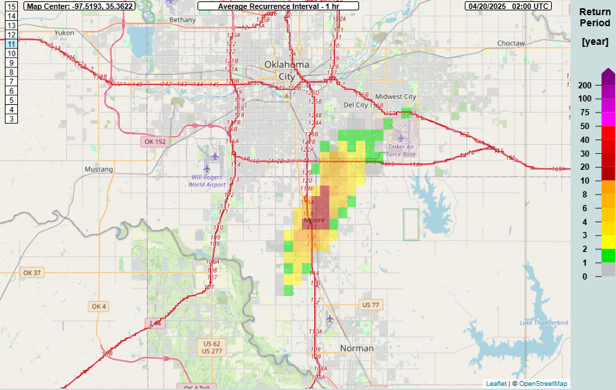 This FLASH product takes the MRMS estimated rainfall and compares it to historical rainfall observations to give an estimate of the likelihood for that amount of rainfall to occur in any given hour, expressed here as the return period. For the area around Moore, the return period for the estimated rainfall is 10 years, essentially meaning that there is a 10% probability that rainfall amount will occur at that given point in a year (i.e., this amount of rain can be expected on average at any point once every ten years).