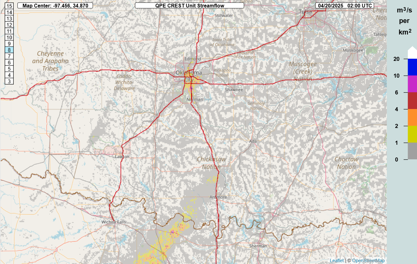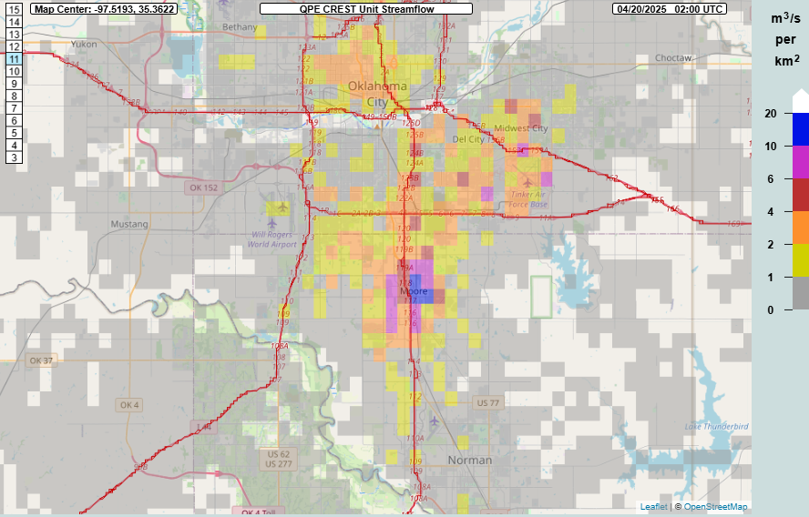 This FLASH product is “unit streamflow.” For this product, the MRMS rainfall estimates are run through a hydrologic model which accounts for the surface the rainfall is occurring over, i.e., wet ground or urban areas produce more runoff than dry ground. This provides an estimation of surface runoff and inundation at each point which is a very good proxy for flash flood potential. Here, as one might expect given the reports that occurred, the values of unit streamflow are maximized over Moore with high values over much of the southern part of the OKC metro area.