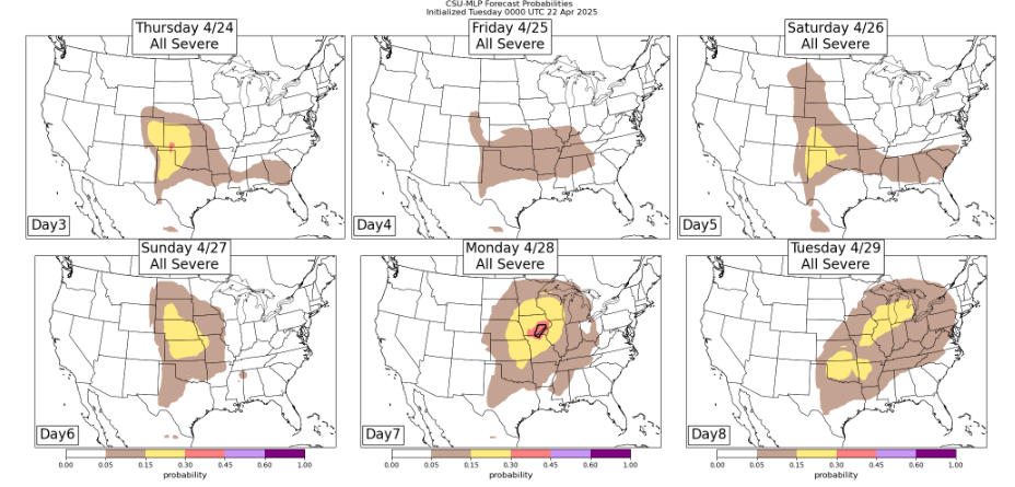 The weather pattern across the central part of the country looks to grow increasingly active through the rest of the week, and especially this weekend and into the early part of next week. The slow moving upper level trough of low pressure off the west coast is expected to intensify and start moving inland into the Southwest. As this happens, stronger disturbances moving through the central U.S. ahead of this trough will yield a more favorable environment for severe storms. The Colorado State University machine learning system (CSU-MLP) shows rather high probabilities next Sunday through Tuesday (days 6-8). Obviously the areas most under risk will need to be refined as the individual weather systems become more clear, but anticipate an overall increase in severe weather activity.