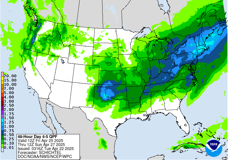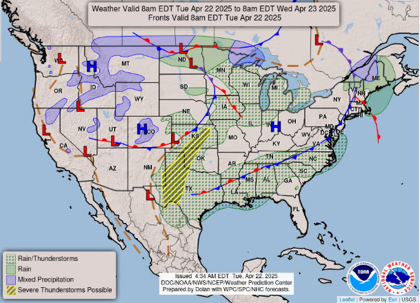 Along with the thunderstorms over the central United States, a disturbance coming through eastern Canada and the Northeast will bring cool and wet weather to that region for the end of the week as well. Cooler than normal conditions will also be in place over the western U.S. under the developing upper trough of low pressure, while much of the rest of the country will see well above normal temperatures much of this week and into the weekend.