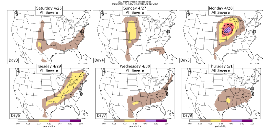 After that system, it appears as though the focus for any severe storms will shift back more into the southern United States as the southern branch of the jet stream becomes more of the driver for active weather again. The CSU-MLP severe weather forecast shows a broad area of low probabilities across that region for now.