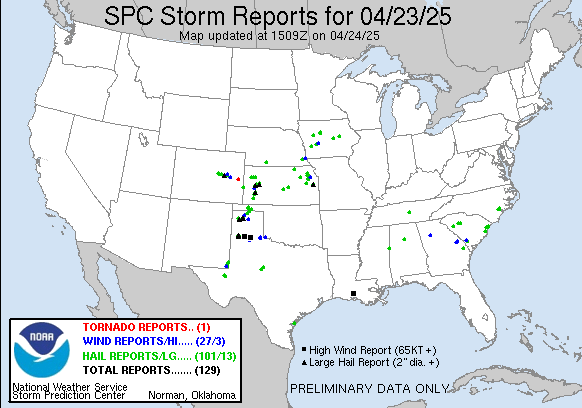 As far as severe weather, over 100 reports of severe wind and hail were received by the Storm Prediction Center (SPC) in the last 24 hours, primarily across the Plains and Midwest. Scattered to numerous thunderstorms over the Southeast also produced several incidences of severe hail and wind.