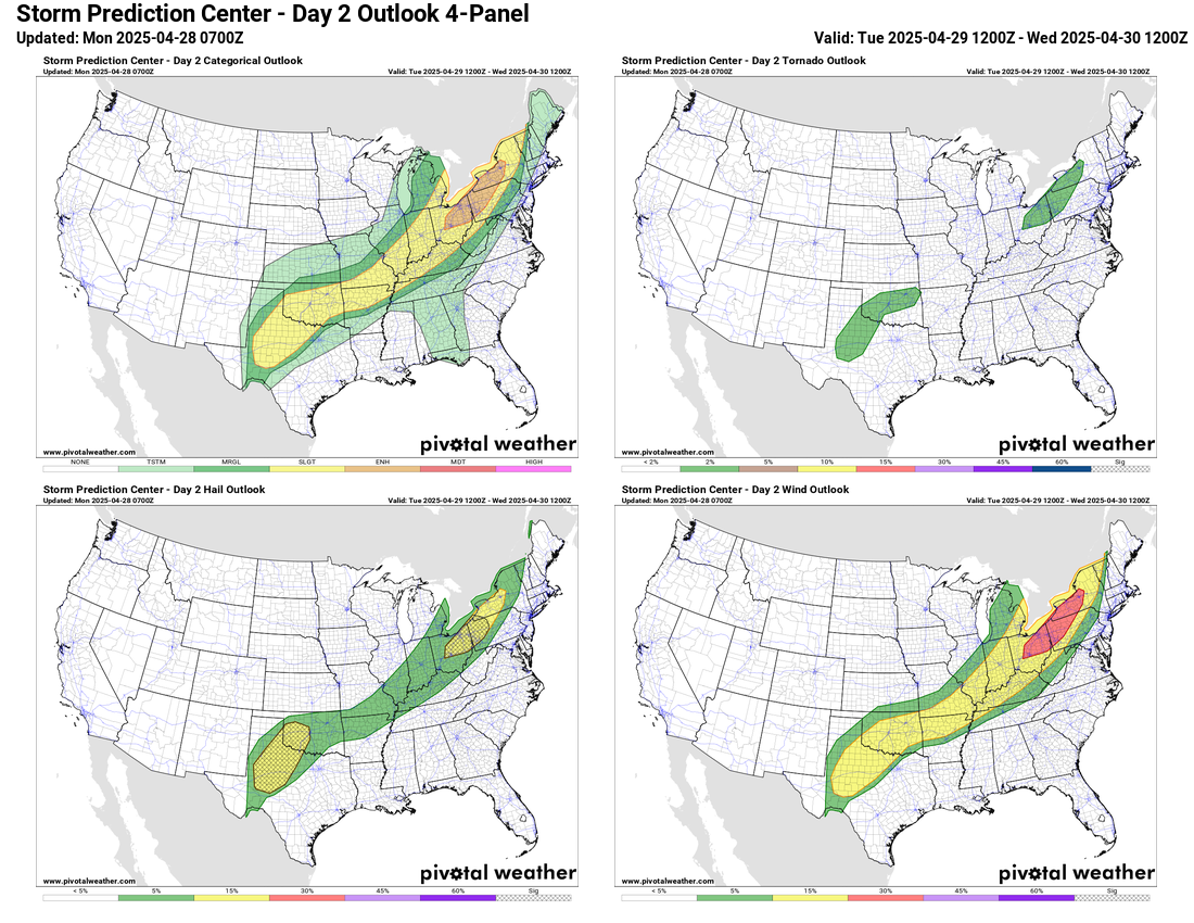 Tomorrow will see the threat of severe weather continue along the front as it slows and starts to become stationary from the Northeast into Texas. As is the case today, the exact evolution of storms is uncertain on Tuesday with a large area of conditions favorable for severe storms but weaker forcing for storm development. SPC has an enhanced (level 3 of 5) risk in the eastern Great Lakes region where the strongest forcing along the front looks like it could produce an organized line of severe storms with damaging winds, large hail and possibly a tornado.