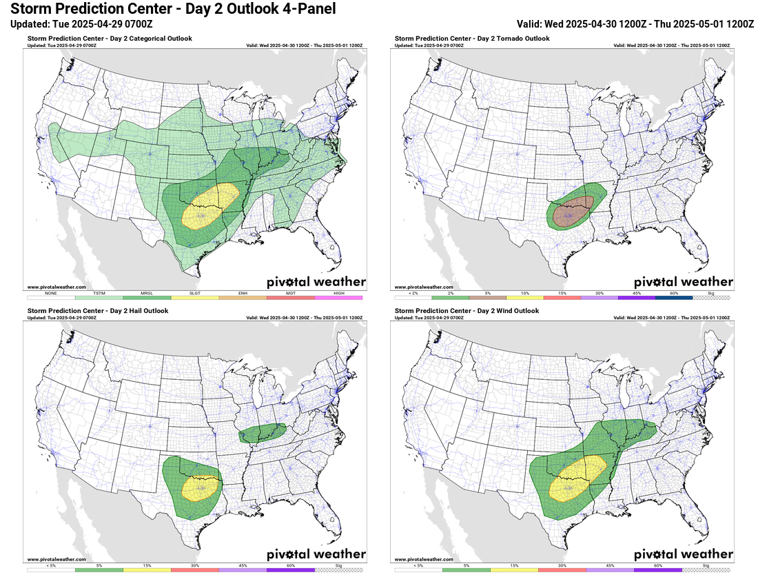 The upper level weather disturbance coming out of the Southwest US will continue to move slowly east on Wednesday, resulting in additional rounds of severe storms with very heavy rainfall. The morning high resolution models suggest another very active day across southern Oklahoma and northern Texas, spreading into western Arkansas. Of particular concern are model rainfall forecasts which suggest totals of 5-10” over the next 48 hours could be common; given the antecedent conditions, this could result in widespread, significant flood and flash flood issues.