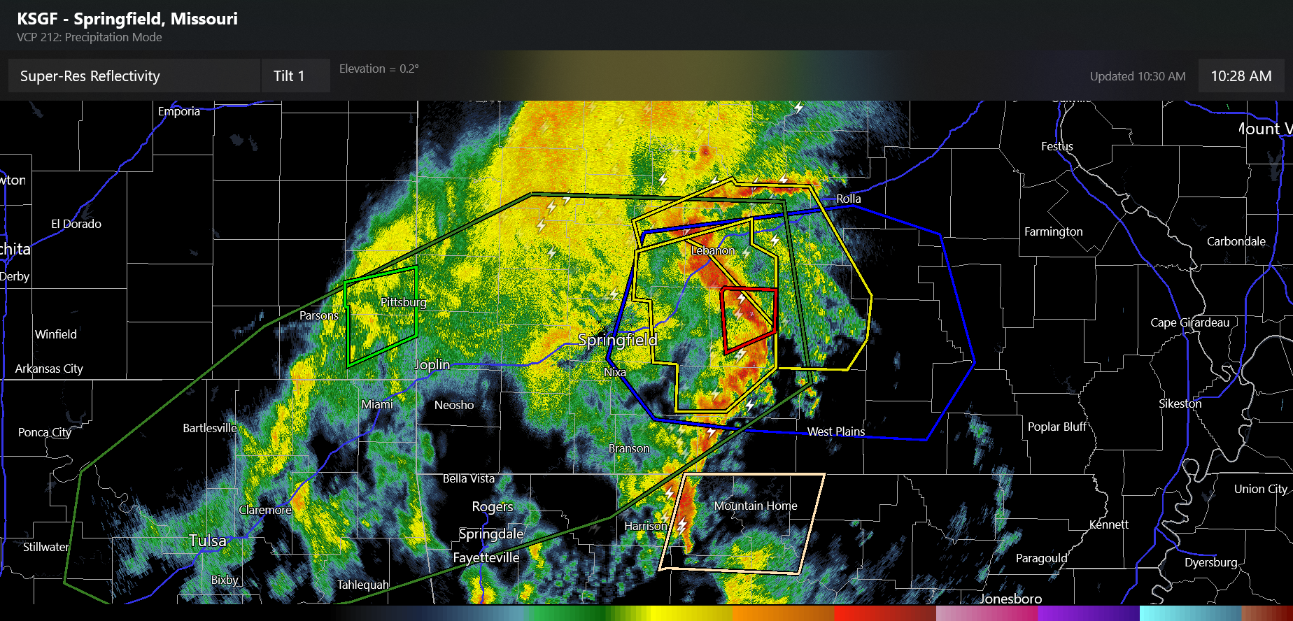 And then there was late last night into this morning. A complex of severe thunderstorms organized over Oklahoma and moved up Interstate 44 into southwest Missouri as a strong bow echo, producing significant wind damage. The official NWS observing site at the Springfield, MO airport reported a wind gust of 90 mph as the bow echo moved through there. More than 20,000 customers are without power in southwest Missouri per PowerOutage.us.