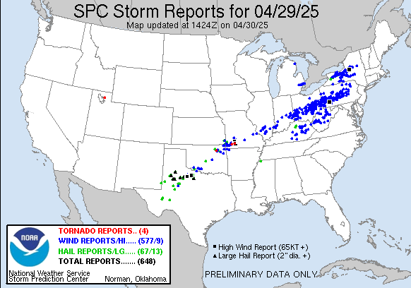 Over 600 reports of severe weather were received yesterday by the Storm Prediction Center along a large swath from northwest Texas to New York state.