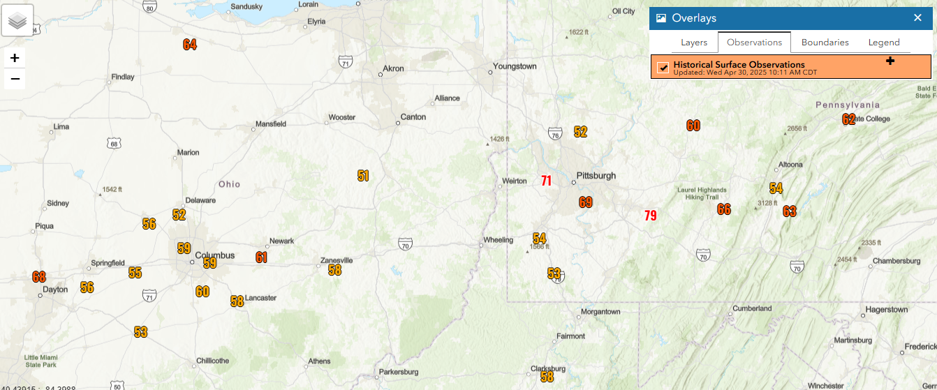 Often with thunderstorm wind events in the East, the damaging wind gusts tend to be rather isolated and sporadic, and those damaging gusts are thus more infrequently measured at official observing sites than tends to be seen in the Plains states. That was not the case with this event, as numerous NWS observing sites reported wind gusts of severe levels – 50 kt or 58 mph – all across central Ohio and western Pennsylvania as you can see above (note that Wheeling, WV had at least 70 mph gusts but their data for yesterday was incomplete which is why it does not show on the map). 79 mph at Latrobe, PA was the highest reported at an official site.