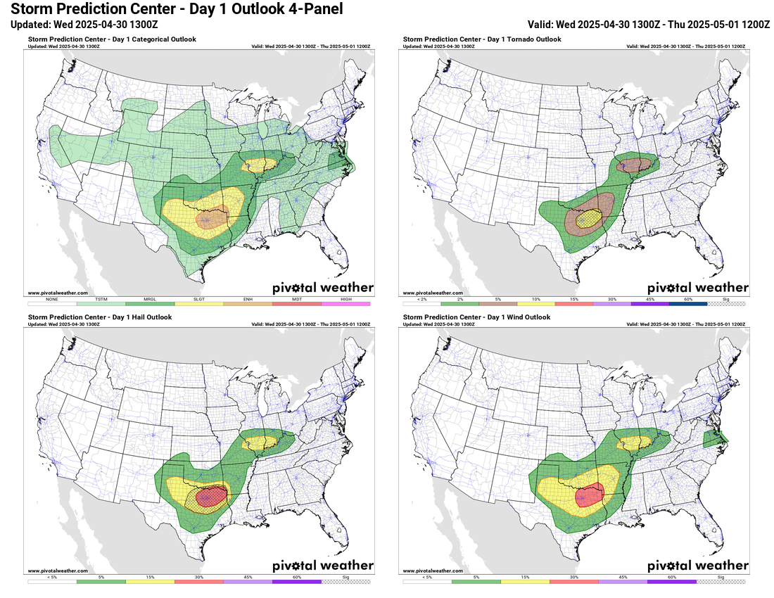 SPC has an enhanced (level 3 of 5) risk in this area for storms capable of producing very large hail, damaging winds and a few strong tornadoes. Additional supercell severe storms could also redevelop farther west over northwest Texas into western Oklahoma this afternoon and evening. Also, scattered thunderstorms should redevelop across the mid-Mississippi Valley this afternoon where conditions will remain somewhat supportive of severe storms, and SPC has a slight (level 2 of 5) risk in this region.