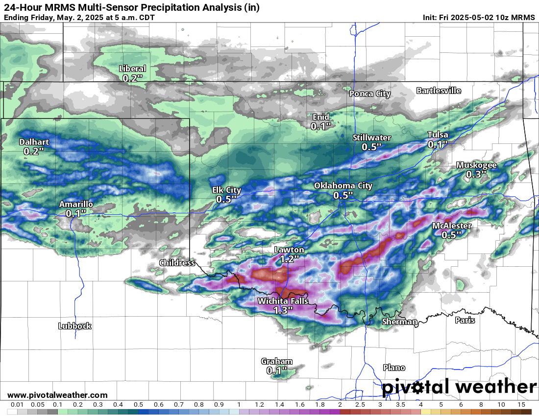 Areas in southwest Oklahoma had localized amounts greater than 4 inches overnight, causing renewed flash flooding. Several Oklahoma Mesonet sites in southern through eastern Oklahoma have received more than 12” of rain in the last 30 days, with a couple of sites approaching 20” over the last month.