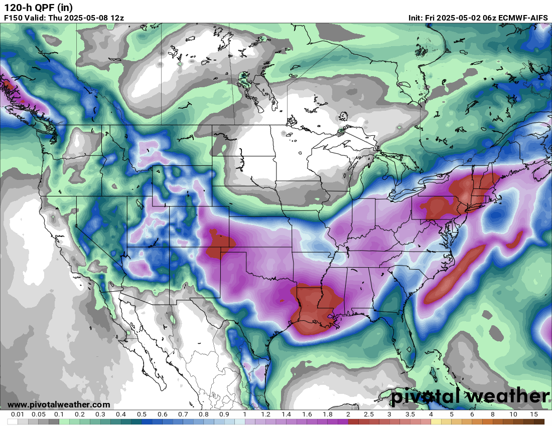 As we head into the early and middle part of next week, the eastern US upper low should start to slowly move east and weaken, but it will bring days of wet weather to much of the East with a large part of the Northeast looking to pick up 3-5” of rain as shown in the European AI model 5 day rainfall ending next Thursday. While much of this region has been experiencing drought, there could eventually be some flooding issues, and WPC has outlooked marginal risks of flash flooding in this region next Monday and Tuesday.