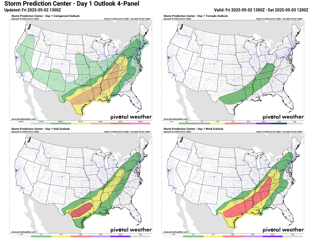 With a nearly stationary front aligned from Texas into the eastern Great Lakes, a broad area along and south of it will see conditions become favorable for severe storms this afternoon and evening and SPC has a large enhanced (level 3 of 5) risk outlooked. Gulf moisture and some daytime heating will result in instability and modestly strongly winds aloft will provide sufficient wind shear for organized severe storms capable of producing large hail and damaging winds. While the threat of organized heavy rainfall is low, given relatively slow moving strong thunderstorms producing heavy rainfall, localized flash flooding is possible in this region as well. The threat of tornadoes is not zero but is relatively low given a lack of wind shear in lower levels of the atmosphere. Areas in central and eastern Texas look to have an enhanced risk of very large hail as instability will become quite strong in this area, leading to potentially intense supercell storms.
