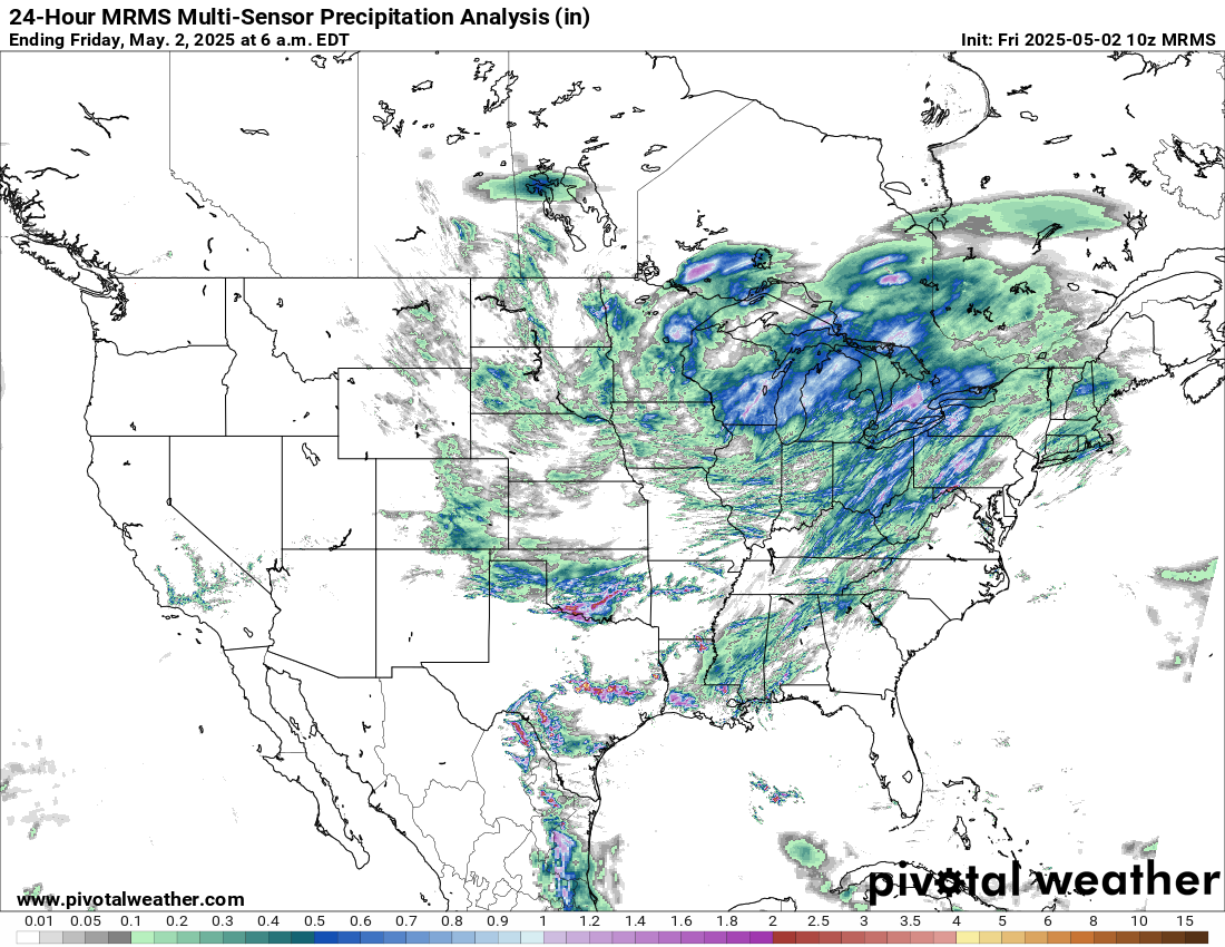 Happy Friday! Starting off with a quick look at the last 24 hours: as expected, there were a couple of focused areas of severe weather reports yesterday and last night, one in Oklahoma and another in the eastern Great Lakes. An additional area ended up being in central Texas, where at least one intense supercell storm produced hail up to baseball sized and a tornado near Briggs, TX that damaged several homes and injured one person.