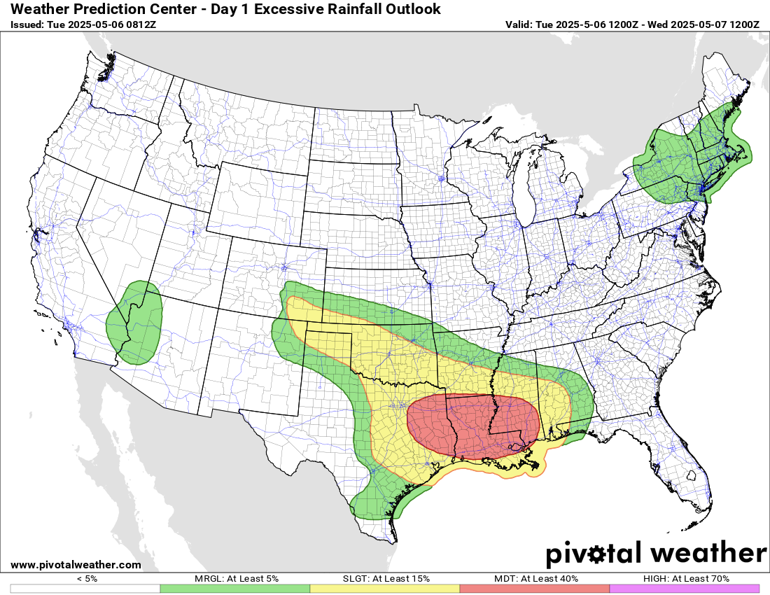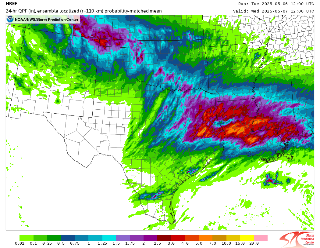 In addition to the severe weather risk, flash flooding will also be a significant concern today, and the Weather Prediction Center has a large area from eastern Texas to southern Mississippi in a moderate (level 3 of 4) risk of flash flooding today into tonight. The morning High Resolution Ensemble Forecast (HREF) system suggests that bands of 5-7” of rain will be common across this region, and given recent heavy rainfall in parts of this area, numerous incidences of flash flooding will be likely.