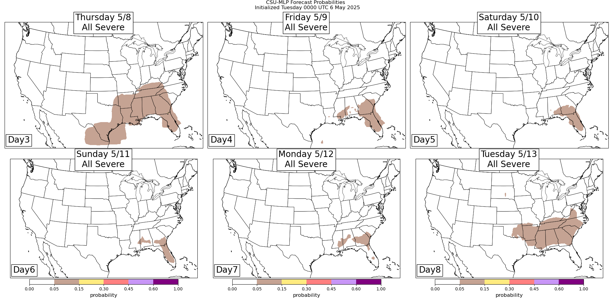 As we have been discussing the last several days, the upper level low pressure system responsible for the weather over the southern US looks as if it will drift east and southeast to along the Gulf Coast and take up residence for several days. This will mean a number of days of scattered to numerous thunderstorms for the Southeast. While not a high end severe weather risk setup, there certainly could be isolated strong to severe thunderstorms as shown in the CSU machine learning probabilities above. Meanwhile, the western United States will see a large area of high pressure aloft develop, bringing warmer and drier weather, and potentially even some record high temperatures by this weekend.