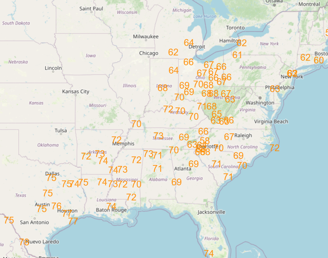 Record warmth is forecast to continue and in the south central states and expand east, peaking on Friday when more than 60 locations are forecast to tie or break record high minimums Friday morning (note: these are the morning forecast lows, some sites could possibly fall lower before midnight and not end up with a daily warm minimum record).