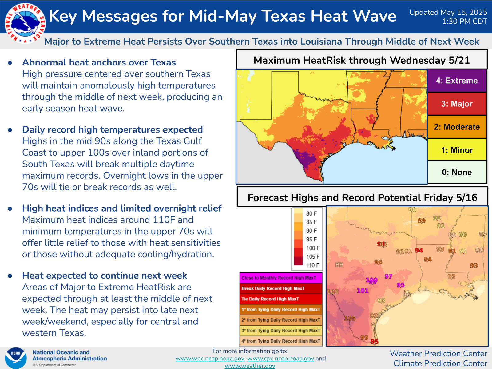 I don’t want to forget about the record warmth occurring over parts of the southern and eastern United States. This graphic from the Weather Prediction Center outlines the heat impacts expected over Texas the next several days. Multiple record high maximums and minimums were set on Thursday, including Chicago O’Hare reaching 94F which broke the old record of 91F, along with record highs at Peoria, IL and Madison, WI and Houston Hobby, San Antonio, Corpus Christi, Brownsville, McAllen, Del Rio and Austin in Texas. More records will be set in the south and east today into the weekend.