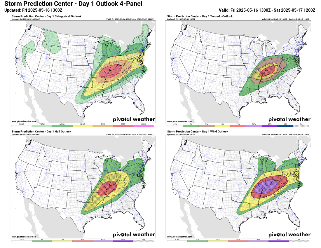 The mode of the thunderstorms will play a big role in the tornado potential. Some of the high resolution models show the storms remaining as individual storms for longer, which would result in a more significant risk of strong, long tracked tornadoes; other models show a more rapid transition to a squall line in the lower Ohio Valley which would likely mean a threat of more widespread straight line wind damage with embedded tornado risk. Regardless, it should be an active severe weather day, and the Storm Prediction Center has a moderate (level 4 of 5) risk in the region. There will also be a risk of at least isolated flash flooding, and the Weather Prediction Center has a slight (level 2 of 4) risk of excessive rainfall in the area.