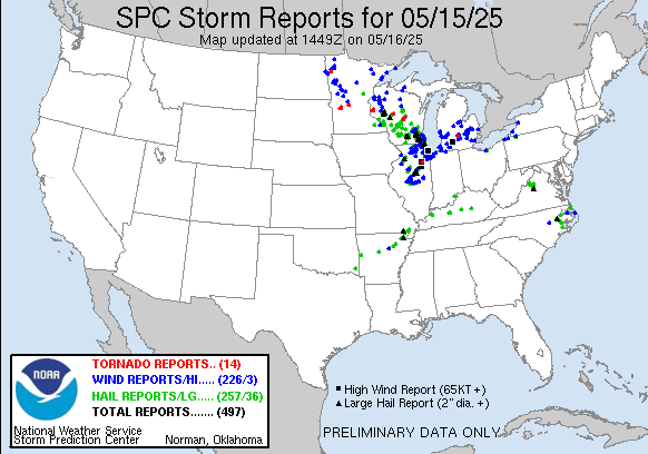 Thursday was a very active severe weather day, with nearly 500 reports of severe weather including three dozen reports of very large hail 2” in diameter or greater. Several tornadoes occurred in Wisconsin, and while luckily casualties seem to have been few there was significant damage to homes in businesses Juneau and Mayville. Read more about it in this article from the Milwaukee Journal Sentinel.
