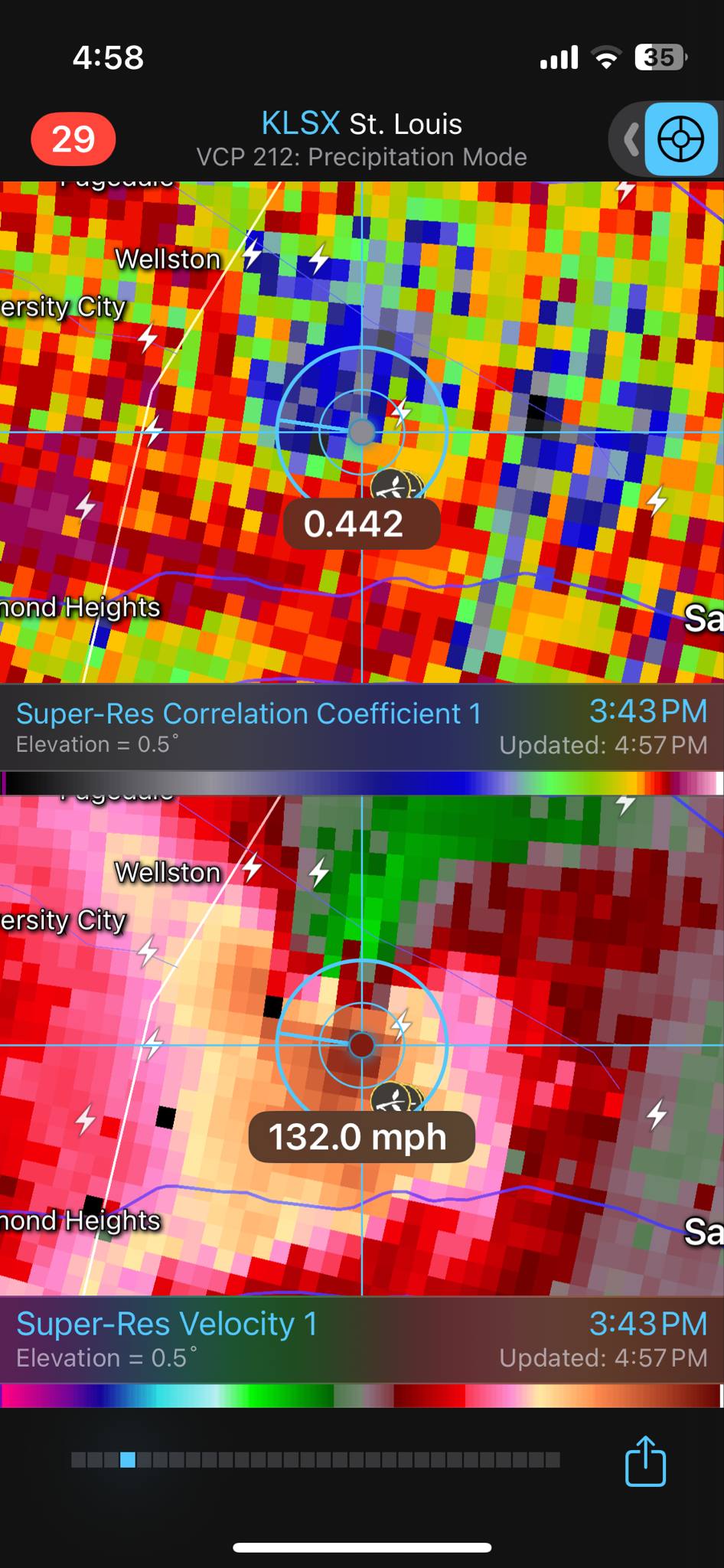 The tornado appears to have initially developed in the Richmond Heights/Clayton area, in the immediate western suburbs of St. Louis, a bit after 3:30 pm CT. By 3:43 pm CT, the St. Louis WSR-88D Doppler radar data as shown above indicated a well developed likely intense tornado on the northwest side of the city of St. Louis, with the radar detecting winds of at least 130 mph (bottom image) and lofted tornadic debris (the blue and grey data southeast of Wellston).