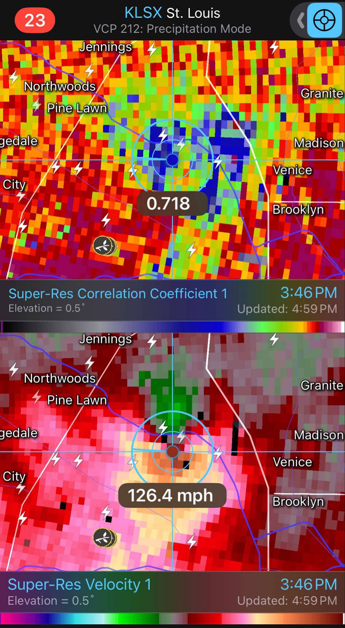 By 3:46 pm, the rapidly moving tornado was approaching the Mississippi River, with radar still detecting greater than 125 mph winds (bottom) and a large debris field from the tornado (areas of blue data west of Madison and Venice in the top image).