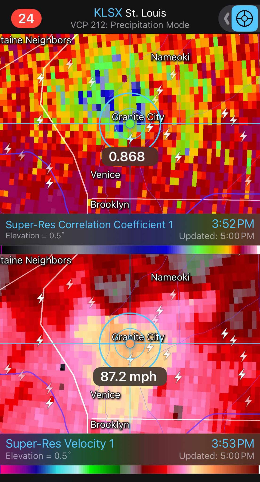 By 3:53 pm, the tornado was likely beginning to occlude – become choked off by colder air coming out of the storm’s downdraft – just north of Granite City, IL, as the velocity data above showed the rotation becoming weaker. There is less green indicating less wind toward the radar which is west of the storm near Weldon Spring, MO, which shows the rotation is weakening. However, there is a large area of intense straight line winds approaching 90 mph in the radar data across Granite City and south into Venice. You can also still see debris in the correlation coefficient data above, although it is a less intense and widespread signature than earlier.