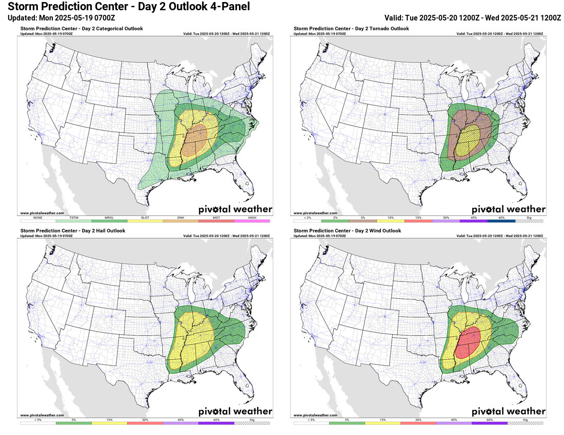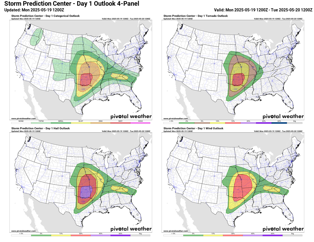 The next 48 hours looks to remain very active, starting today with a moderate (level 4 of 5) risk of severe storms across central and eastern Oklahoma, and large enhanced risk surrounding it. A couple of waves of intense supercell storms should develop this afternoon within a broad area favorable for strong tornadoes, very large hail and damaging winds. These storms should evolve into a complex or two of severe storms that will spread northeast into the Mid-Mississippi Valley overnight.