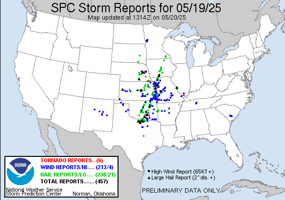 Monday was another busy day over severe weather with nearly 500 reports of severe weather across the middle part of the nation, including more than 20 incidences of very large hail and several tornadoes.