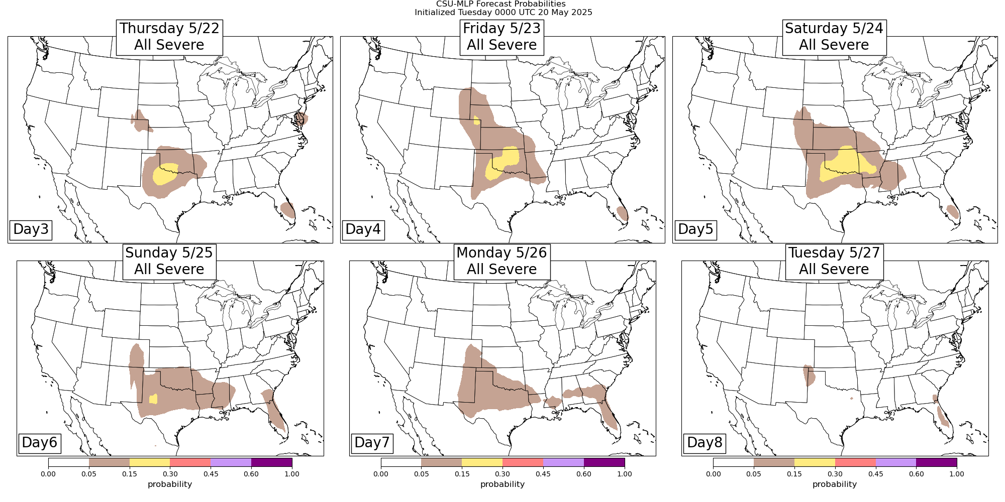 Beyond Wednesday, a large upper level trough of low pressure will develop over the eastern United States with a ridge of high pressure developing in the West. Overall, this will be a much less active pattern for severe weather. However, northwest flow in middle and upper levels of the atmosphere along with an increasingly unstable airmass will likely result in some severe thunderstorm activity in the Southern Plains and eventually the Arklatex region later this week.