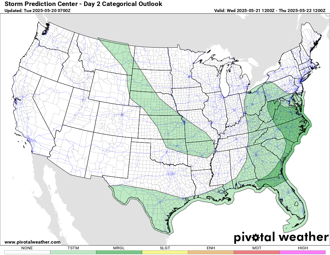 The storm system responsible for the severe weather today will continue to move east Wednesday with scattered showers and thunderstorms expected across the region. While the threat of severe storms and heavy rainfall will be less than the last several days, there will likely be some isolated incidences of severe weather and flash flooding, with a marginal (level 1 of 5) risk of severe weather along the East Coast.