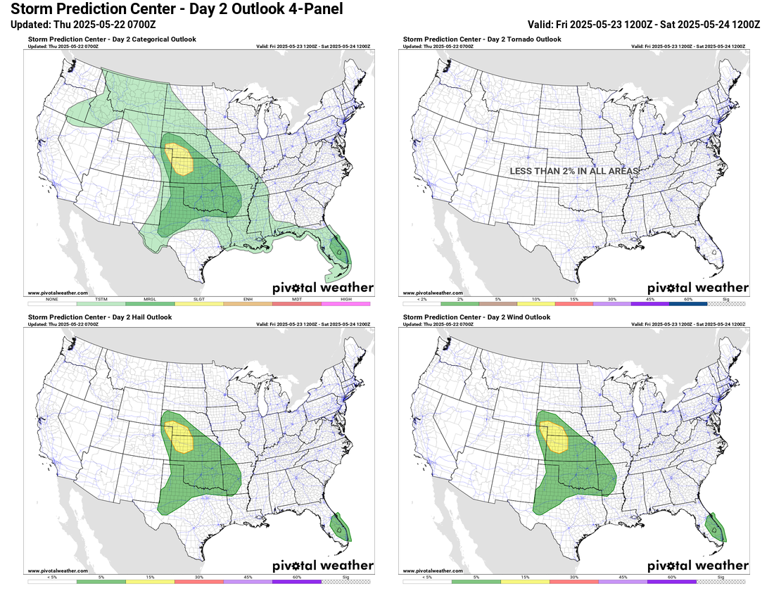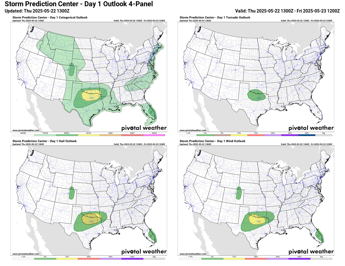 Additional clusters of thunderstorms are expected to move southeast across the central United States Friday and Friday night, with a large area of marginal to slight (level 1-2 of 5) risks of severe storms. Heavy rainfall will also become a greater concern as repeated rounds of storms move across the same areas, and the Weather Prediction Center has a slight (level 2 of 4) risk of excessive rainfall in areas between Tulsa and Springfield, MO. Meanwhile, the Northeast and Great Lakes regions will continue to be damp and unseasonably cool.