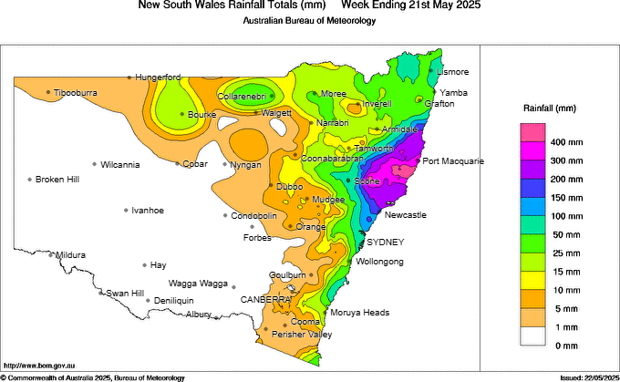 I want to first focus on the major flooding occurring in southeast Australia. This graphic from the Australian Bureau of Meteorology (BoM) shows rainfall in New South Wales over the last week, and you can see widespread amounts greater than 200 mm (~8”) in the region north of Sydney, with an area south of Port Macquarie having received more than 400 mm (~16”). Massive record flooding is occurring in this region, with three people confirmed dead and thousands of people evacuated or stranded; BBC reports people are being rescued by helicopter off rooftops.