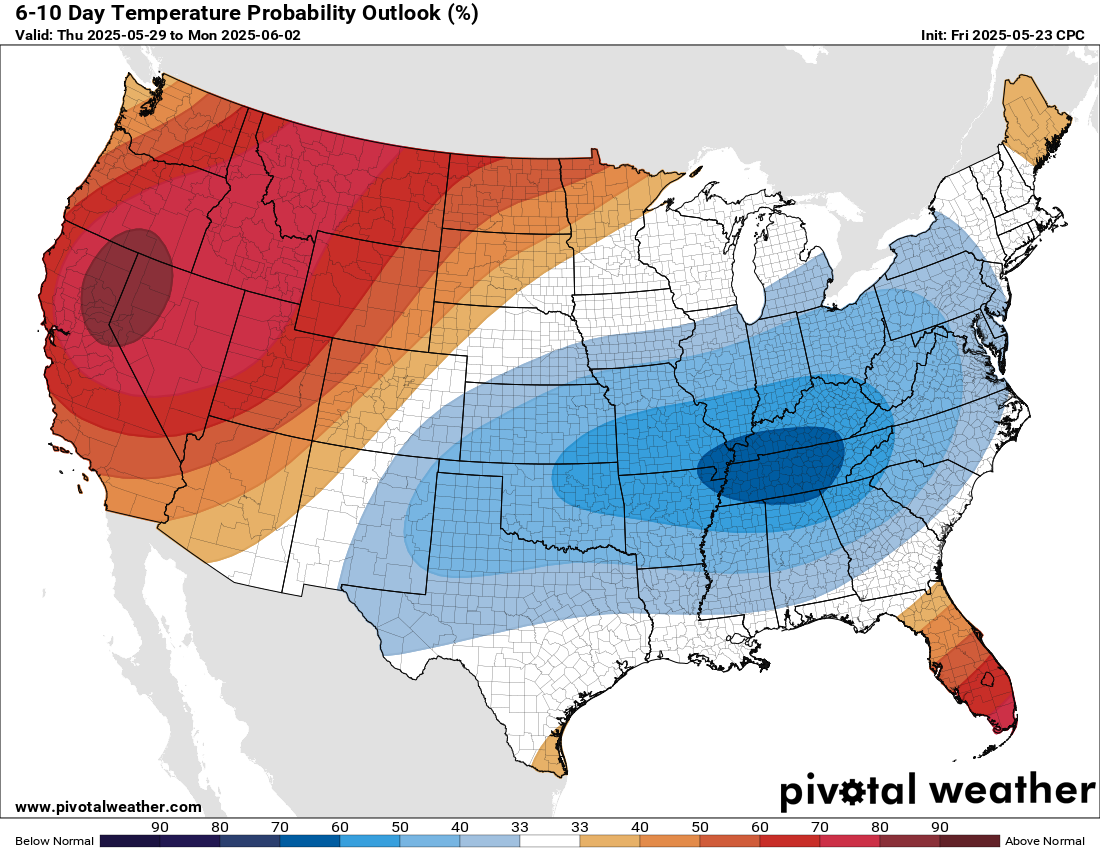 As we head into next week, the weather pattern will trend toward an upper level trough of low pressure in the eastern US and a building ridge of high pressure aloft along the west coast. This will lead to cooler than normal temperatures for much of the east – except Florida – while the west sees building early summer heat with some record warmth possible by late in the week.