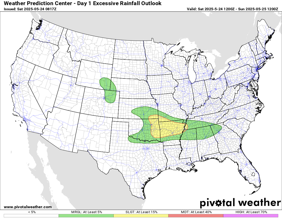 The risk of flash flooding looks as if it will increase on Sunday as a slow moving upper level area of low pressure to the west begins to focus more intense thunderstorm activity along the stationary front. The Weather Prediction Center has placed moderate (level 3 of 4) risk of excessive rainfall across northeast Oklahoma, northwest Arkansas and southwest Missouri while a large slight (level 2 of 4) risk surround this area.
