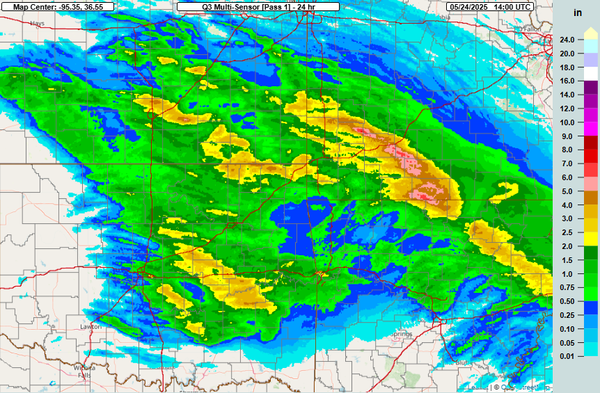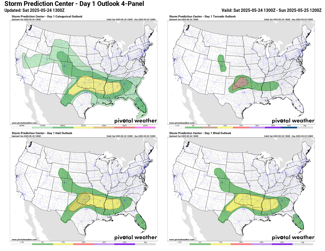 Friday ended up being a pretty active day across the center of the country, as several clusters of thunderstorms moved southeast along a stationary front across the region. A few different waves of severe storms moved across Oklahoma into Friday night, producing a number of reports of large hail and damaging winds. Additionally, supercell storms developed Friday afternoon in the upslope regions of eastern Colorado and produced several tornadoes along with a number of reports of very large hail up to 3” in diameter.