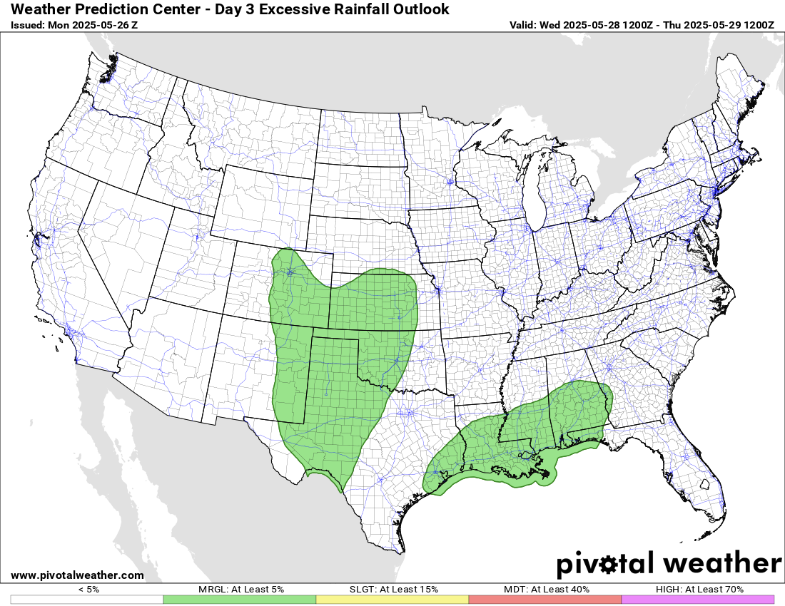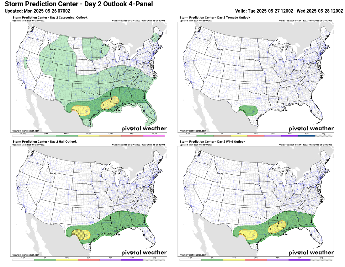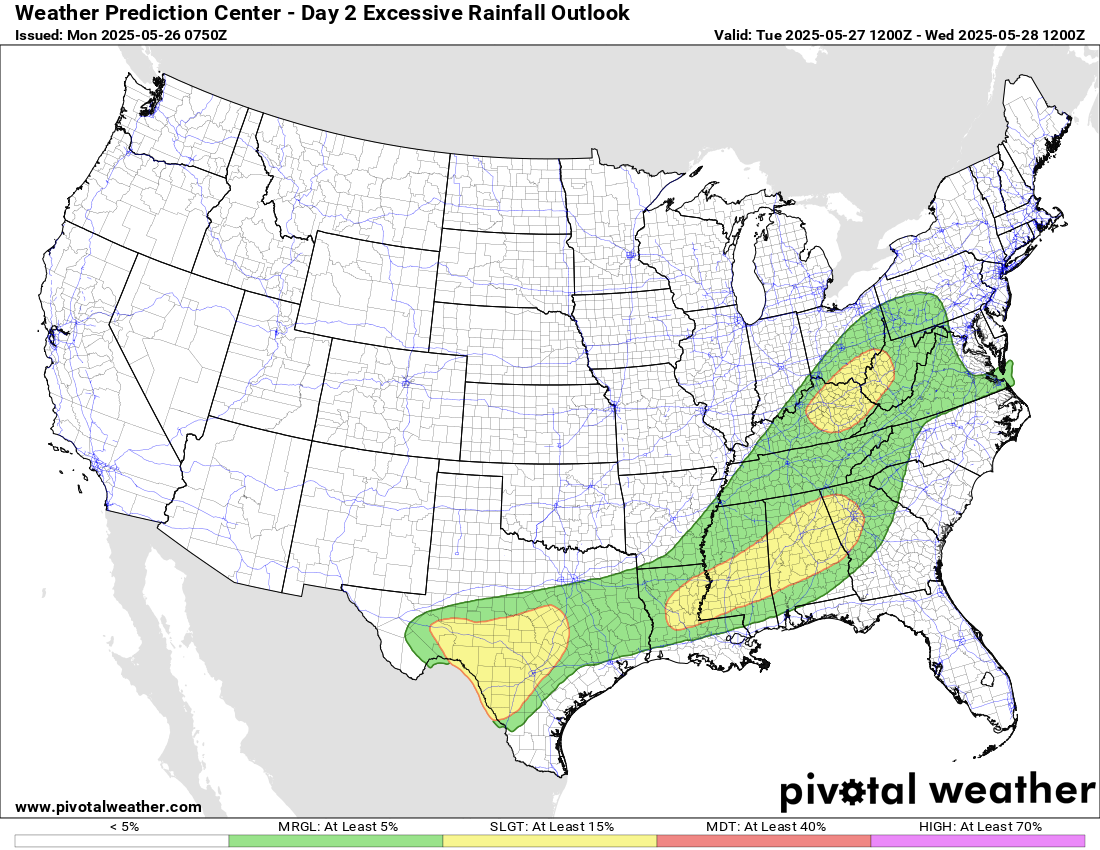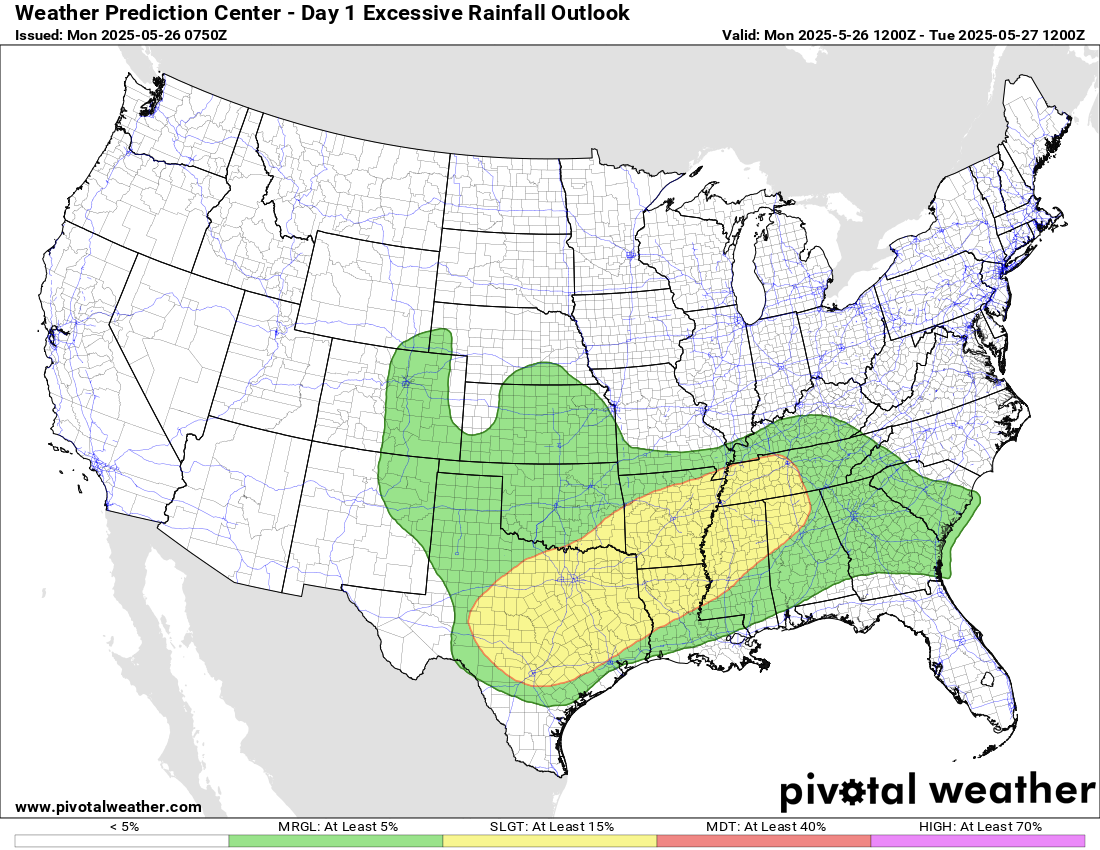 Training storms could also result in some localized flash flooding, and the Weather Prediction Center has a large slight (level 2 of 4) risk of excessive rainfall from Texas across the Tennessee Valley.