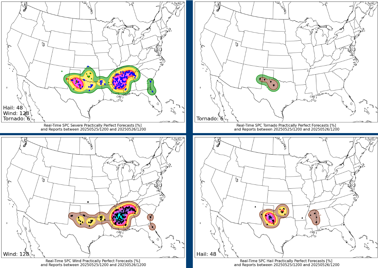 The above graphics show the “practically perfect forecast” of the severe reports from the last 24 hours – essentially taking the reports and mapping them using the Storm Prediction Center’s forecast methodology, providing what the SPC probabilistic forecast for yesterday “should” have been if it had been a perfect forecast. You can see the wind report map in the lower left actually has a rather large 60% area from northern Mississippi across the Tennessee Valley – which per SPC’s conversion between probabilities and categorical outlooks would imply a moderate (level 4 of 5) risk. However, while there were numerous reports of severe weather, they were mainly rather marginal in intensity, and societal impacts were likely rather sporadic; power outages are not elevated in the region this morning, and reading through the reports, they are mostly downed trees.