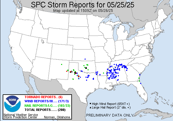 There was plenty of severe weather again over the last 24 hours, and the SPC map of reports provides an opportunity to look at one of the challenges of severe weather forecasting and communication: distinguishing between coverage and intensity of severe weather. As expected, the most intense severe storms on Sunday and Sunday night were in the Southern Plains, as clusters of supercell storms produced more than 30 reports of very large (2” or larger) hail and several tornadoes. From a coverage perspective, though, the most widespread severe weather occurred over the Mid-South and Tennessee Valley region, where a band of severe storms moved during the late afternoon and evening hours, producing more than 100 reports of wind damage.