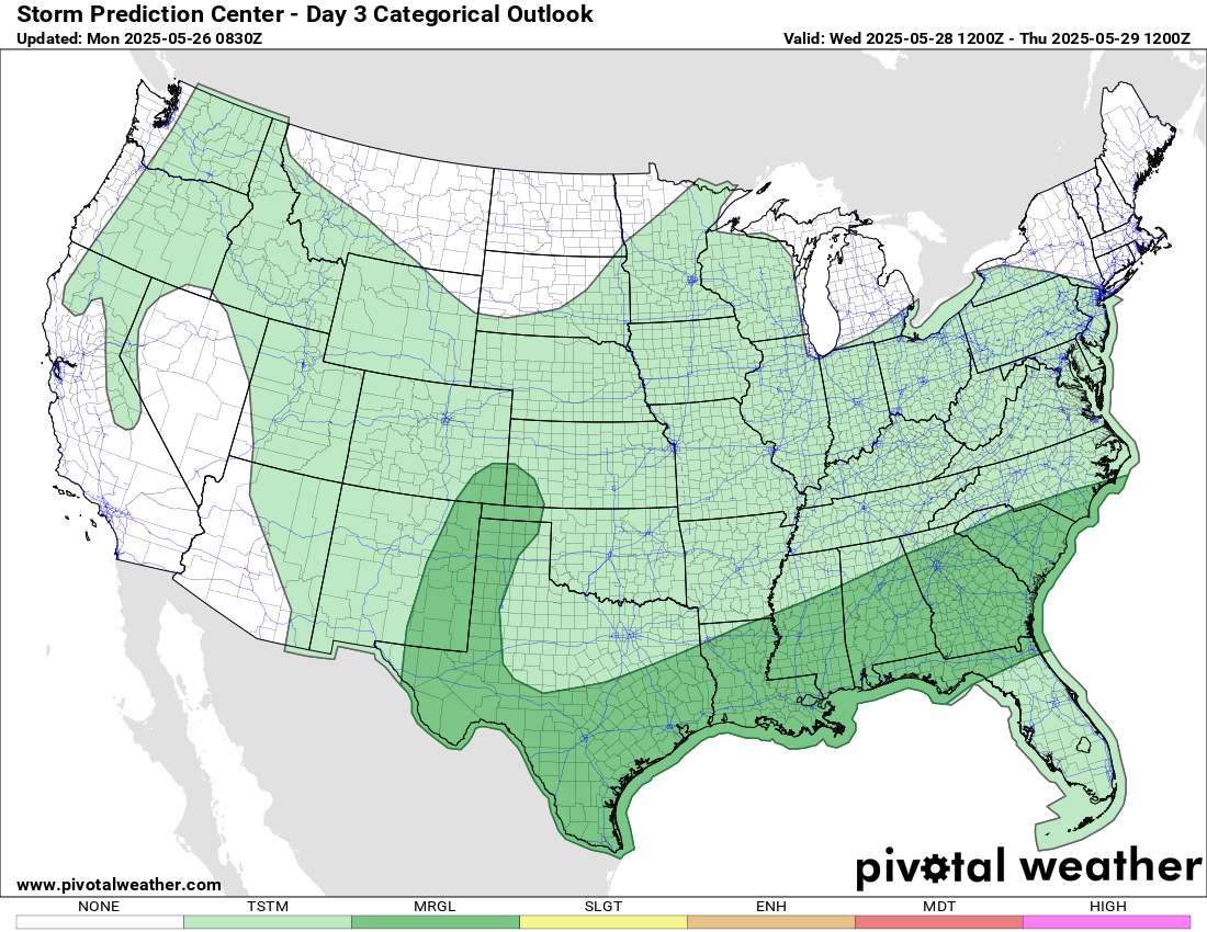 By Wednesday, the slow moving front will be along the Gulf Coast and then northwest nito the central Plains region, with a continuing risk for strong storms and locally heavy rainfall along it.