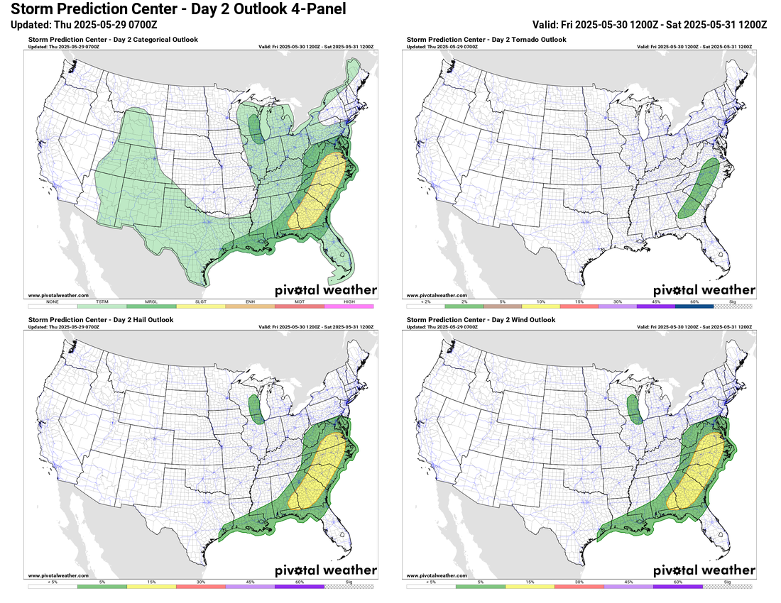 As we go into Friday, the developing upper level weather pattern of a strong trough of low pressure in the East will focus a more organized risk of severe storms from the Mid-Atlantic to the Florida Panhandle. Bands of severe storms moving through this area ahead of a cold front could produce damaging winds, large hail and perhaps a tornado or two.