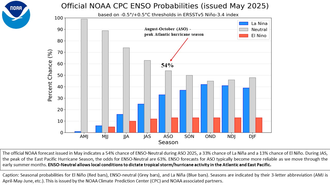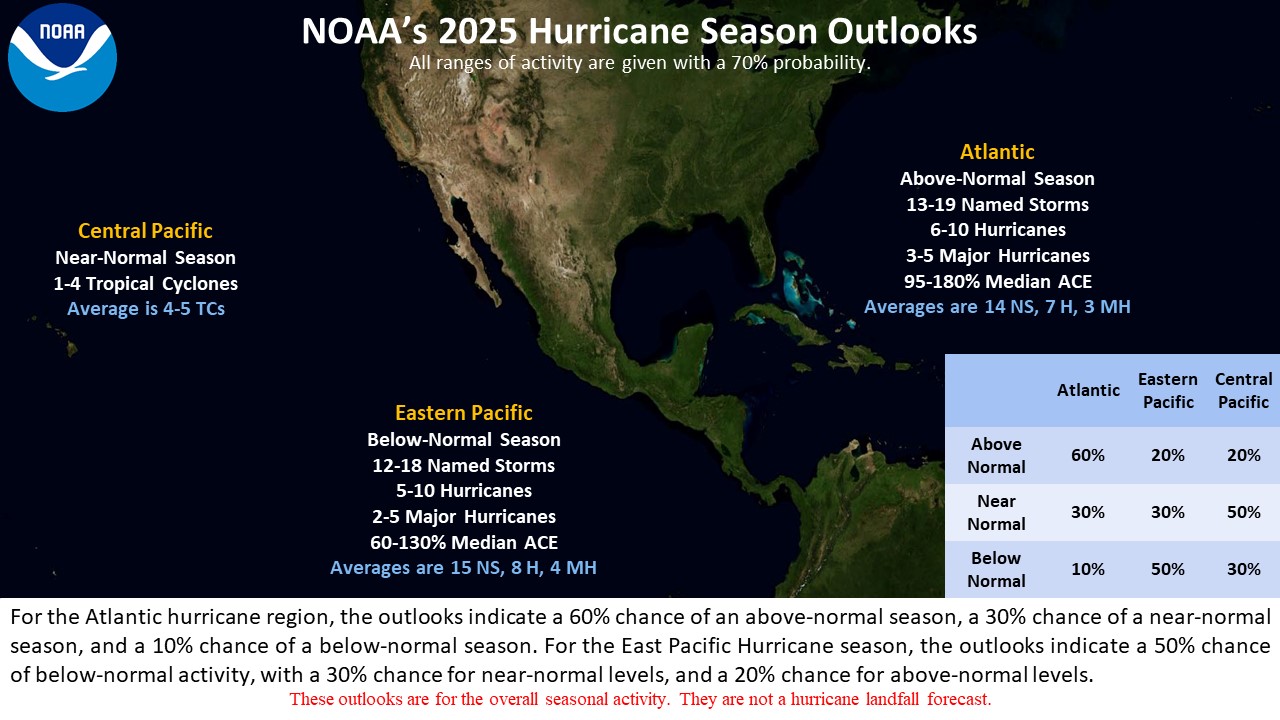 Probably the other most well known seasonal hurricane outlook is the one done by the Tropical Cyclone Research and Forecasting team at Colorado State University. This scientific group was started in the 1980s by pioneering scientist Dr. William Gray, who led the initial groundbreaking research on seasonal hurricane forecasting. The team at CSU under Dr. Gray’s leadership started producing seasonal hurricane outlooks in 1984, and continues to do so today under the leadership of Dr. Philip Klotzbach. CSU’s 2025 outlook was issued on April 3rd, and is generally consistent with the outlook issued last week by CPC. CSU will update their outlook on June 11th.