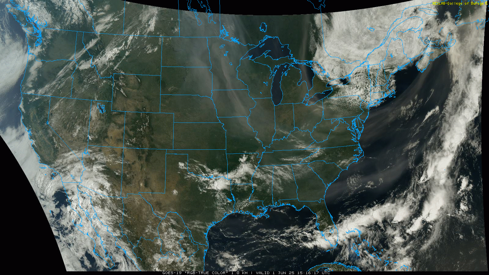 The thickest near-surface smoke is over the upper Midwest, where air quality alerts are in effect for Minnesota and the Upper Peninsula of Michigan. The latest smoke forecast from the High Resolution Rapid Refresh (HRRR) model shows a couple of additional waves of smoke coming into the upper Midwest over the next couple of days behind a cold front that will be moving into the region tonight. Unfortunately, the weather for the next several days in Manitoba and Saskatchewan does not look particularly promising for the fires to be brought under more control.