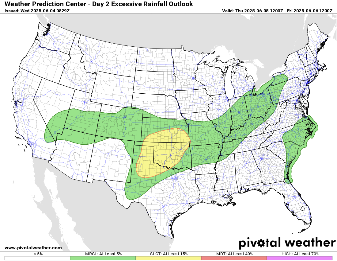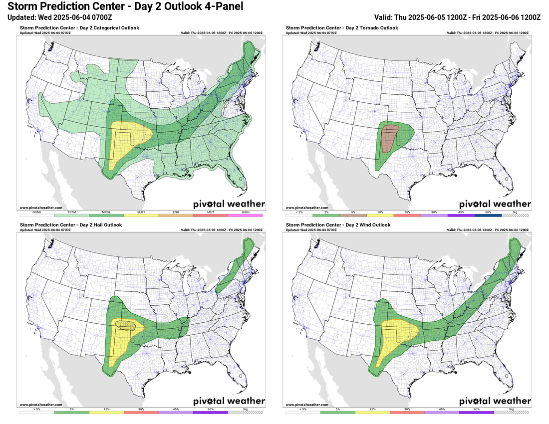 Today does look to be a quieter day overall. Pockets of strong storms and heavy rainfall will continue to be possible along the slow moving cold front from eastern Texas north into the Great Lakes region. A bit of a more organized severe weather threat may develop later today in eastern New Mexico and northwest Texas where SPC has a slight (level 2 of 5) risk of severe storms that could produce large hail, damaging winds and possibly a tornado.