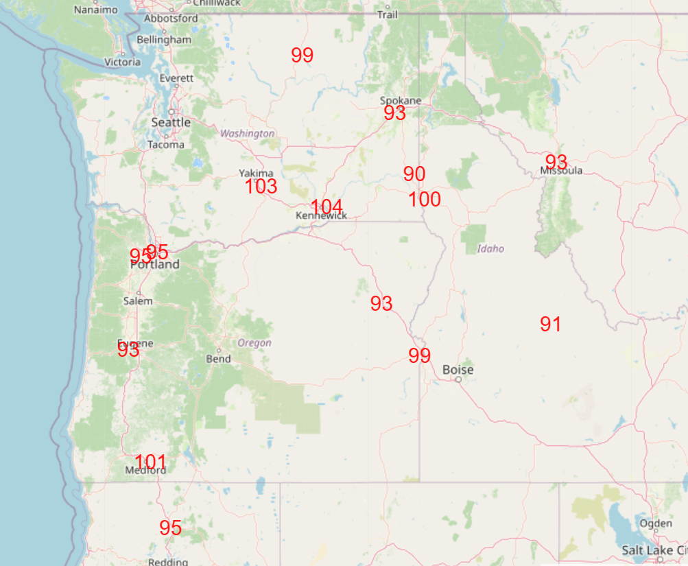 Another weather story yesterday was record heat in the Northwest, as a number of record high temperatures were set, including at Portland (96F, previous record was 94F in 1955). More record heat is anticipated today, with a number of triple digit readings likely.
