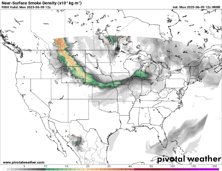 More northwesterly flow at all levels of the atmosphere will be transporting additional wildfire smoke south from the central Canadian wildfires into the United States the next few days. The top loop shows the near surface smoke concentration as forecast by the HRRR-Smoke model over the next 48 hours, with a wave of thicker smoke anticipated to move down into the Dakotas. Meanwhile, the bottom loop is the HRRR forecast of vertically integrated smoke – i.e., smoke throughout the atmosphere – and several waves are forecast to rotate through the central and eastern US over the next couple of days.