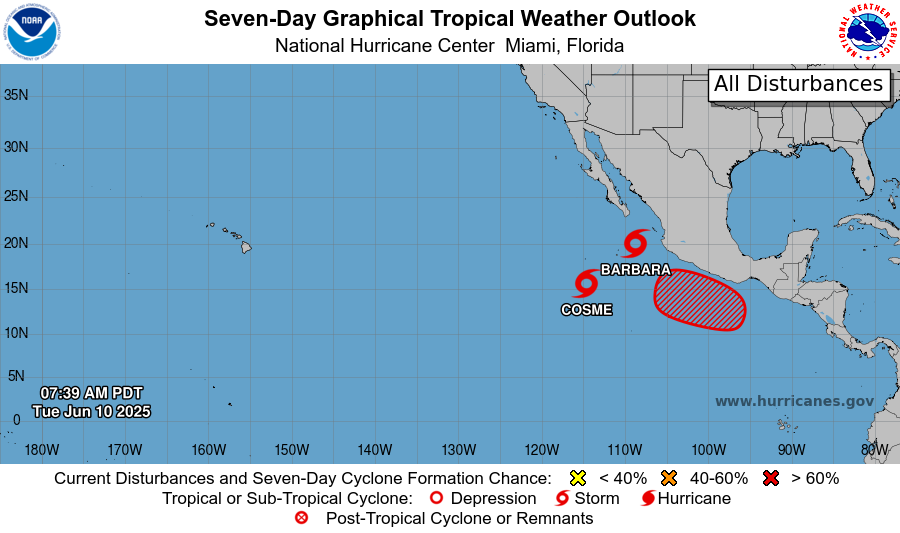 For the first ten days of June, the eastern Pacific has been where the tropical action has been focused, really globally. There have been three eastern Pacific tropical cyclones during this period: Alvin, Barbara, and Cosme. Barbara briefly reached hurricane intensity, but is now weakening along with Cosme, which reached strong tropical storm intensity at its peak. Barbara and Cosme are both anticipated to continue weakening into remnant lows in the next couple of days as they move west.