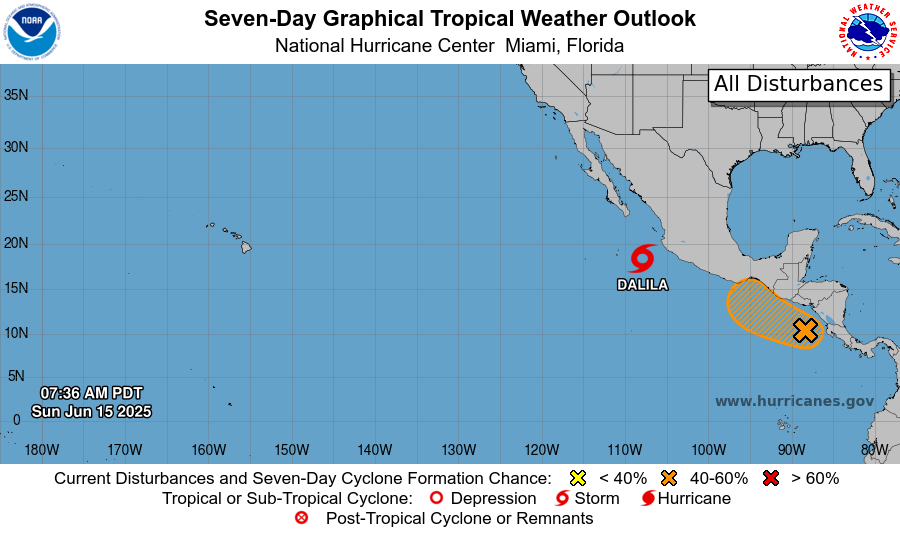 The eastern Pacific continues to be the focus of attention in the tropics, with Tropical Storm Dalila expected to turn west and weaken while another system looks likely to develop west of central America with potential impacts to coastal regions there. Most of the models now imply that the eastern Pacific will continue to be the area of focus with little risk of development in the Atlantic over the next week.