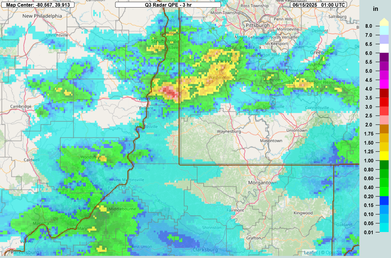 We have been talking the last few days about how locally heavy rainfall could cause isolated flash flooding issues across much of the eastern US. During Saturday evening, a relatively small band of thunderstorms developed from the central West Virginia Panhandle into southwest Pennsylvania, and caused a band of 1-3” of rain in about 3 hours, with a localized maximum of 2-4” just east of Wheeling, WV.
