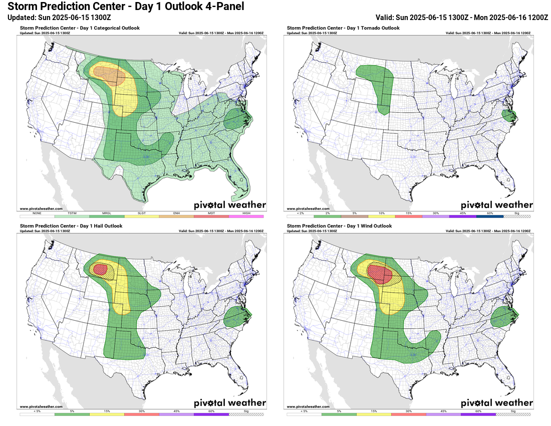 The weather disturbance responsible for today’s severe weather should shift east into the upper Midwest on Monday, with an enhanced (level 3 of 5) risk of severe storms as scattered intense supercells with very large hail, damaging winds and tornadoes are anticipated.