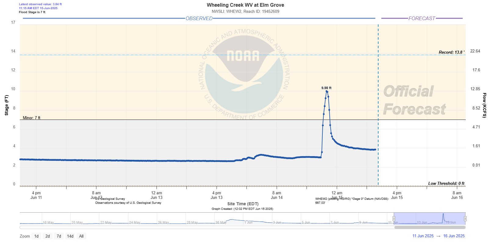 Unfortunately, that localized maximum in rainfall fell in an area with complex terrain and in the headwaters of creeks and streams that run through Wheeling into the Ohio River. With high rainfall rates – much of the rain shown in the map above fell in about 2 hours – and wet soils from a wet spring in the region, rapid runoff occurred and streams and creeks saw extremely rapid rises out of their banks. An example is shown above as Wheeling Creek rose from less than 3 feet to 10 feet and well above flood state in a matter of minutes.