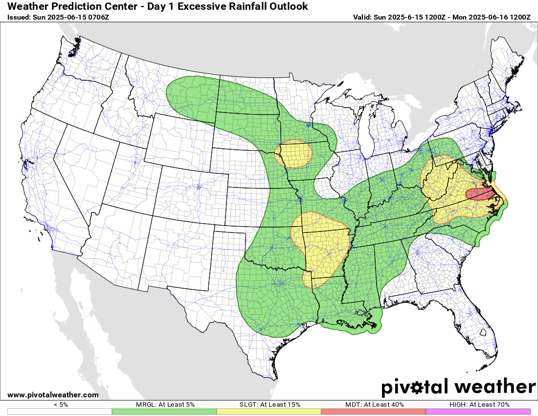 Looking ahead at the flash flood risk for today, a widespread marginal risk of excessive rainfall is in place over most of the eastern United States, with a few slight risk areas where more concentrated areas of thunderstorms producing heavy rain are expected. The area over the Mid-Atlantic into the central Appalachians appears to be the most vulnerable given recent rainfall and above normal moisture values, and WPC has put a moderate (level 3 of 4) risk for parts of southeast Virginia and northeast North Carolina.
